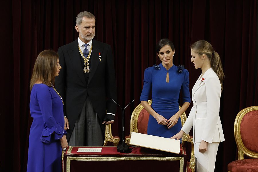 La princesa Leonor cumplió 18 años el 31 de octubre, día en el que juró la Constitución, 37 años después de que lo hiciera su padre. Fue en un acto solemne en las Cortes Generales, y haciendo uso de la misma fórmula que empleó el rey Felipe VI el 30 de enero de 1986. Sobre el mismo ejemplar de la Carta Magna clamaba: "Juro desempeñar fielmente mis funciones, guardar y hacer guardar la Constitución y las leyes y respetar los derechos de los ciudadanos y de las comunidades autónomas y fidelidad al rey".