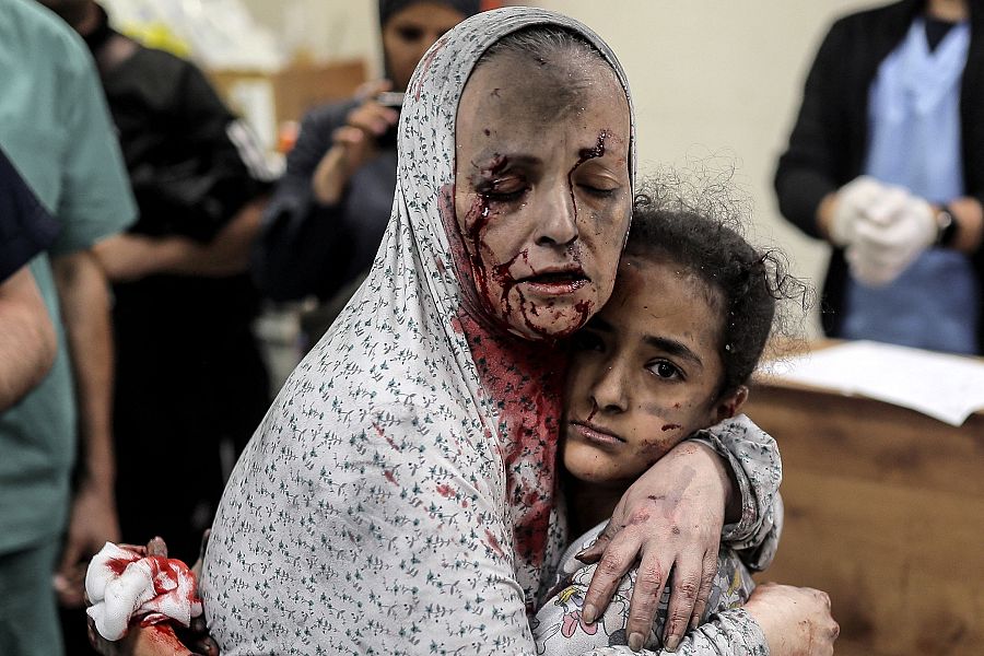 Una mujer palestina herida abraza a una niña en un hospital de Gaza tras un bombardeo israelí (BELAL KHALED / AFP)