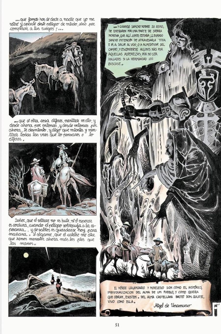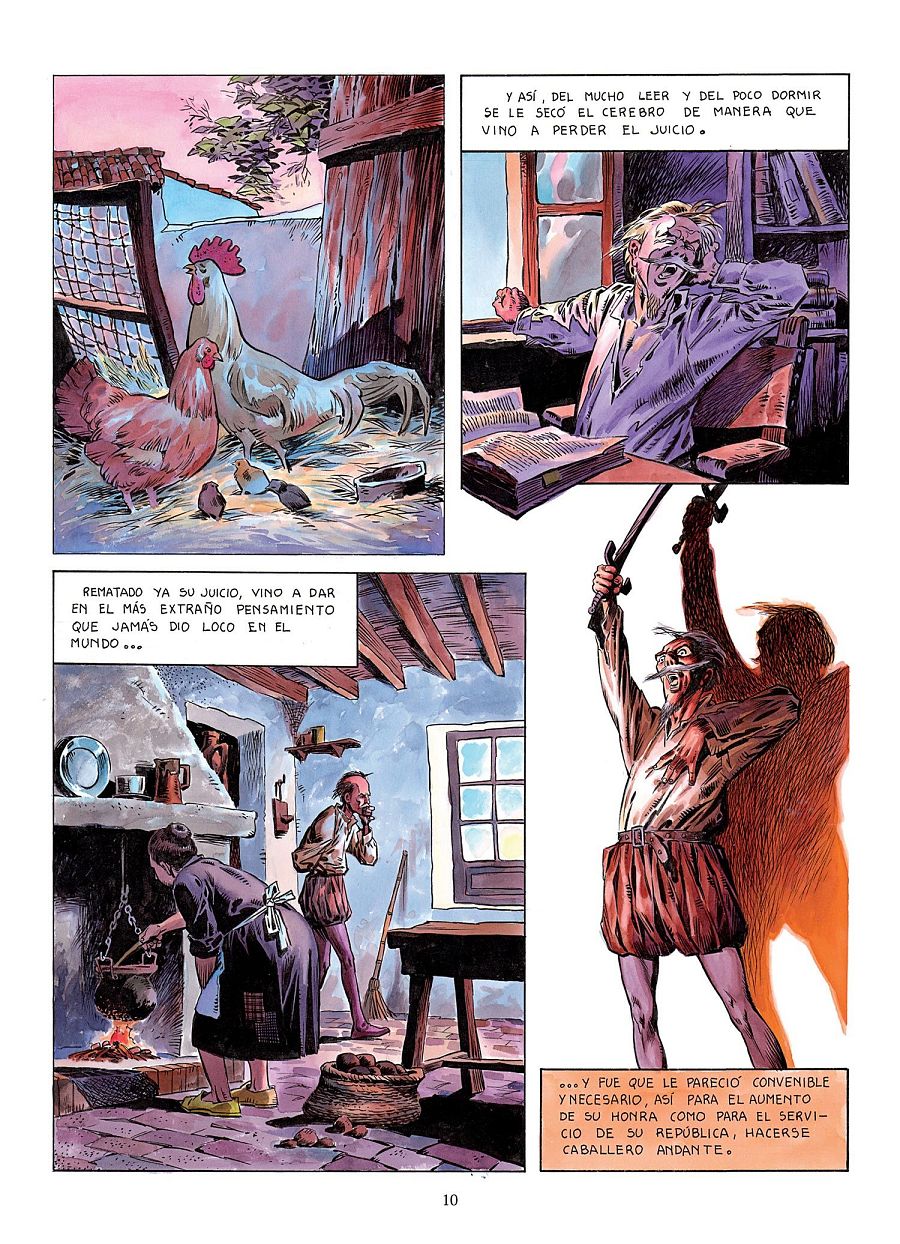 Abarcar una novela tan compleja es complicado y por eso el dibujante decidió centrarse en algunos episodios de la primera parte, tan conocidos como el episodio en que vela las armas en la posada y es nombrado caballero por el posadero, la quema de libros, el enfrentamiento con los gigantes (molinos) o la liberación de los galeotes.