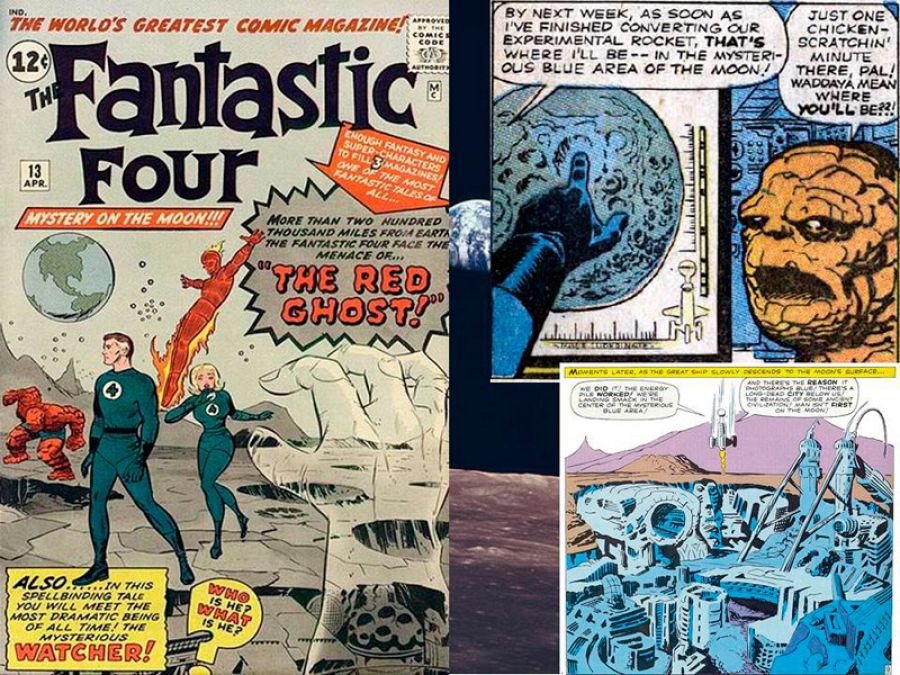 El 12 de septiembre de 1962 John F. Kennedy pronunció su famoso discurso en el que se comprometía a llegar a la luna antes de 1970. Lo que recrudeció la carrera espacial con la URSS. Unos meses antes (noviembre de 1961) nacía el Universo Marvel de los Cómics con la publicación de Los Cuatro Fantásticos, un grupo que debía sus poderes a un fallido viaje espacial y que también pisó la Luna antes que el Apolo XI, concretamente en su número 13 (Abril, 1963). En la Luna descubrían la llamada Área azul donde reside El Vigilante, un ser de una raza que se dedica a presenciar el devenir del Universo, pero que ha jurado no intervenir nunca.
