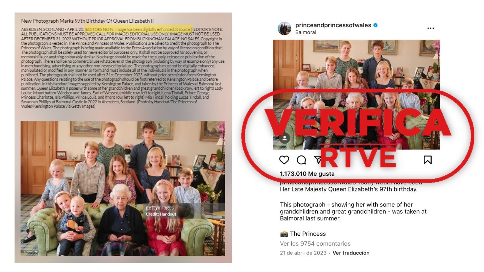 La imagen que ahora cuestionan las agencias Getty y Reuters es una instantánea publicada por los perfiles oficiales de los príncipes de Gales en las redes sociales X e Instagram el 21 de abril de 2023 para recordar a la fallecida reina Isabel II en el que hubiera sido su 97º cumpleaños: "Hoy habría sido el 97º cumpleaños de Su Majestad la Reina Isabel. Esta fotografía, que la muestra con algunos de sus nietos y bisnietos, fue tomada en Balmoral el verano pasado", dice el texto en inglés que acompaña a la imagen y que presenta a "la princesa de Gales" como la autora de la instantánea.