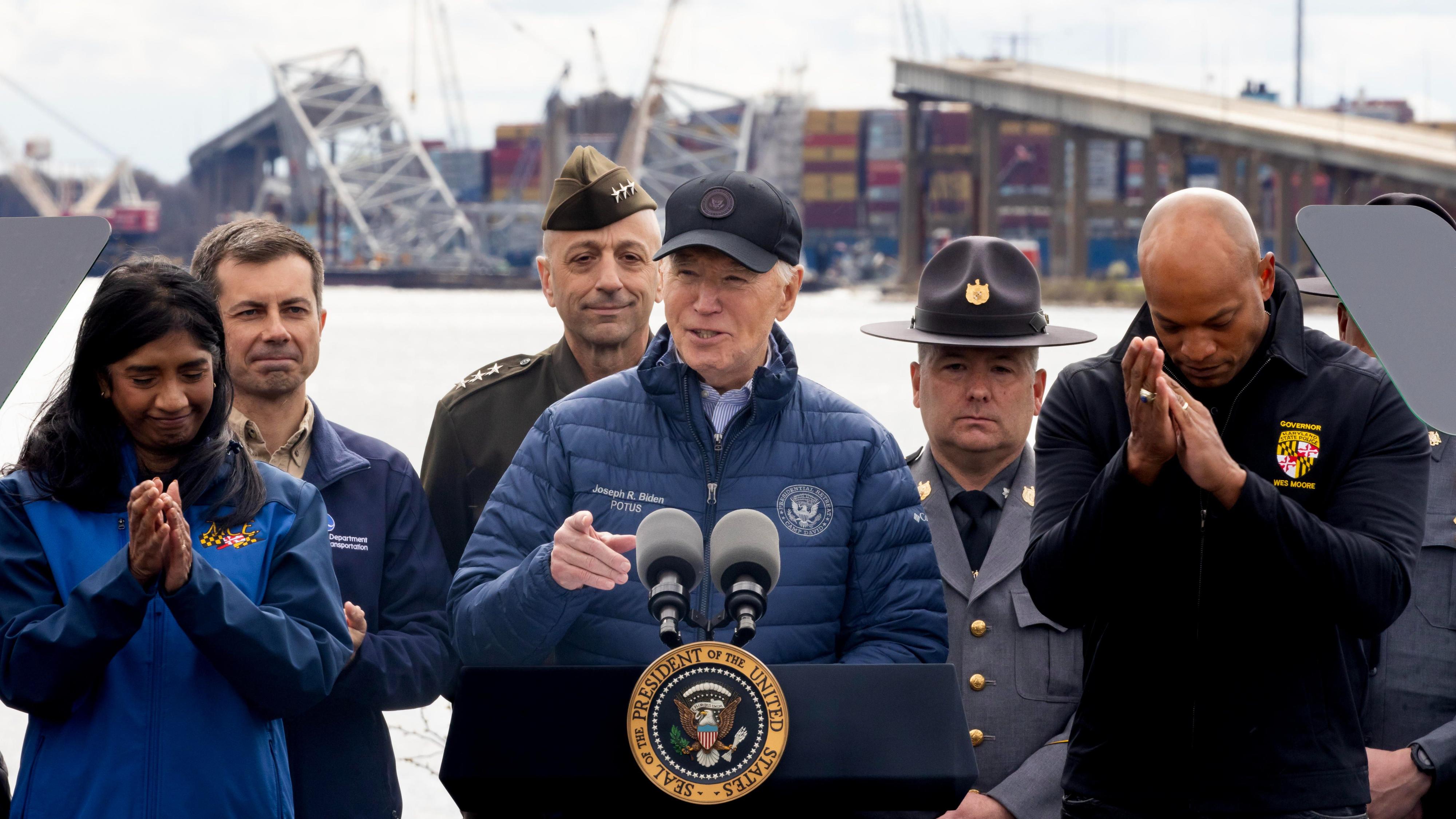 A bordo del helicóptero presidencial Marine One, Biden ha sobrevolado las labores de remoción de escombros, donde todavía permanecen tanto la estructura derrumbada como el carguero, y luego se ha reunido con autoridades locales, ingenieros y miembros de la Guardia Costera de Estados Unidos.