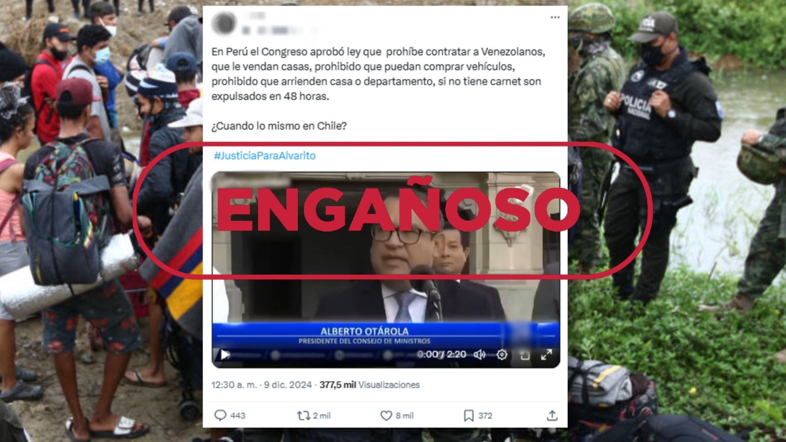 "En Perú el Congreso aprobó ley que prohíbe contratar a Venezolanos, que le vendan casas, prohibido que puedan comprar vehículos, prohibido que arrienden casa o departamento, si no tiene carnet son expulsados en 48 horas(sic)", dice un mensaje compartido más de 2.700 veces en la red social X desde el 9 de diciembre. La publicación adjunta una grabación de 2 minutos y 20 segundos de duración en la que aparece el expresidente del Consejo de Ministros de Perú, Alberto Otárola, mientras una voz en off le atribuye las siguientes declaraciones: "Venezolanos, tienen que regresar a su país". A continuación, se muestran fragmentos de informativos peruanos entre otras imágenes de recurso mientras escuchamos que "con la nueva ley de expulsiones los venezolanos sin carnet de extranjería tienen 48 horas para salir del Perú". La misma voz en off asegura que "la nueva ley sanciona a aquellos propietarios que alquilen sus viviendas a venezolanos indocumentados".