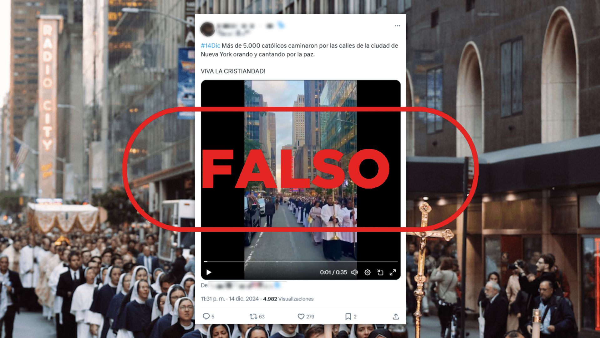 "Más de 5.000 católicos caminando por las calles de Nueva York, rezando y cantando por la paz", dice un mensaje compartido más de 12.000 veces el 14 de diciembre en la red social X. La publicación concluye con la afirmación: "Los grandes medios de comunicación censuraron esto. ¡Hazlo VIRAL! Nunca repudies tus orígenes". El texto adjunta una grabación de 35 segundos que muestra una procesión católica en una calle con rascacielos. Otra publicación de X difunde este vídeo con una afirmación similar y la etiqueta "#14Dic". Además, encontramos la grabación difundida con un mensaje en inglés que traslada la misma idea. La secuencia también ha circulado en Facebook y Telegram como si fuera actual.