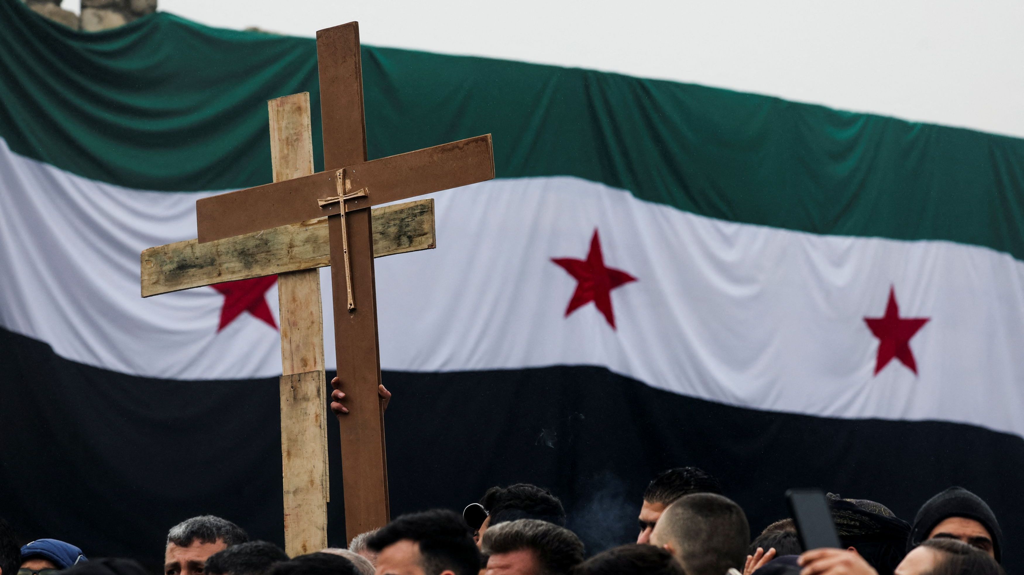 De manera espontánea, miles de manifestantes, que portaban cruces de madera e izaban la nueva bandera del país, se echaron a las calles para expresar su descontento y sus temores ante la caída de Bachar al Asad.