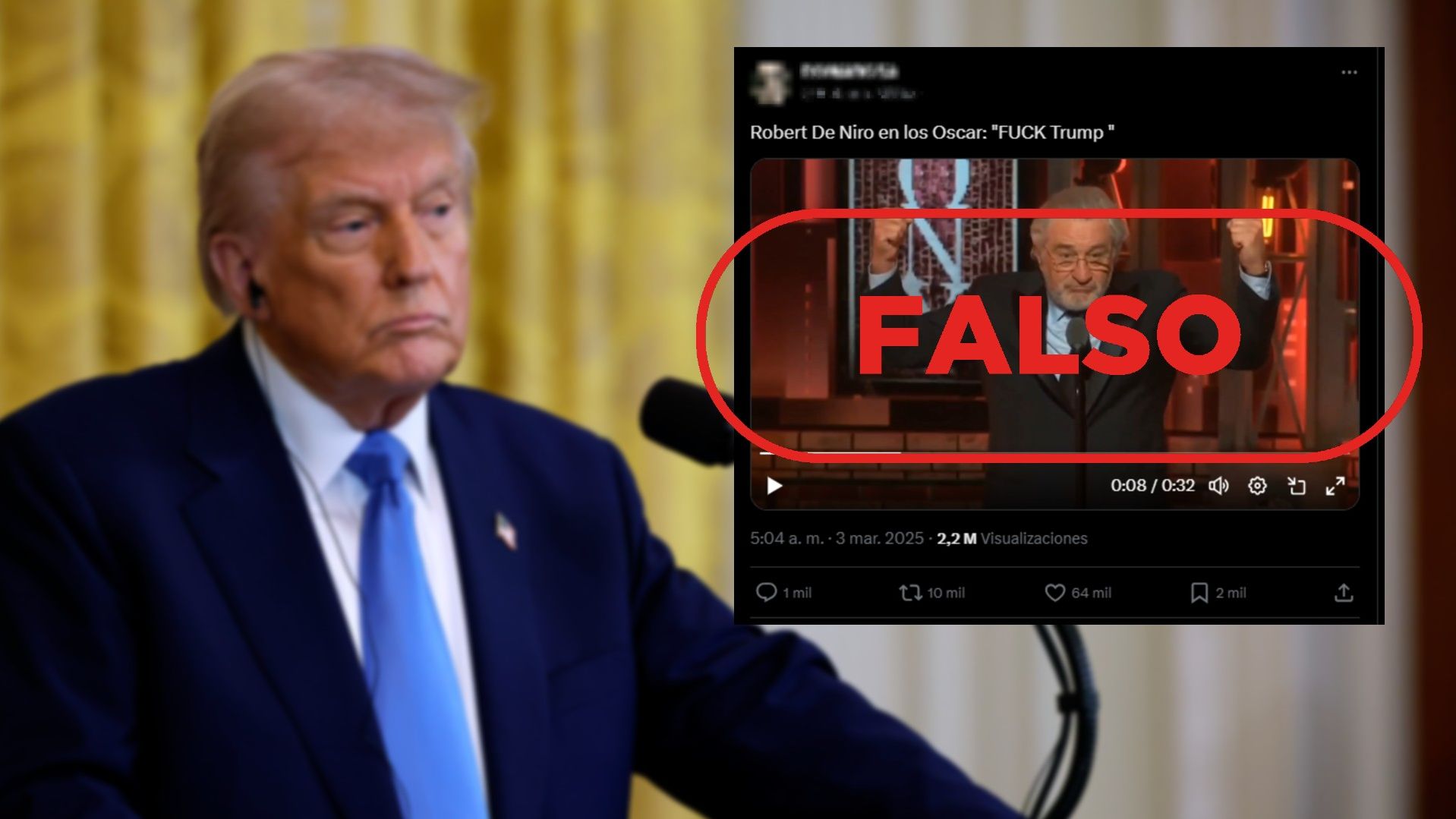 “Robert De Niro en los Oscar: ‘FUCK Trump (sic)’”, leemos en un mensaje compartido más de 10.000 veces en la red social X desde el 3 de marzo. La publicación adjunta una grabación de 32 segundos en la que el actor estadounidense camina hacia un micrófono sobre un escenario para acto seguido declarar en inglés: “Voy a decir una cosa: Que le jodan a Trump”. A continuación, permanece en silencio mientras es ovacionado por la audiencia presente en el evento.