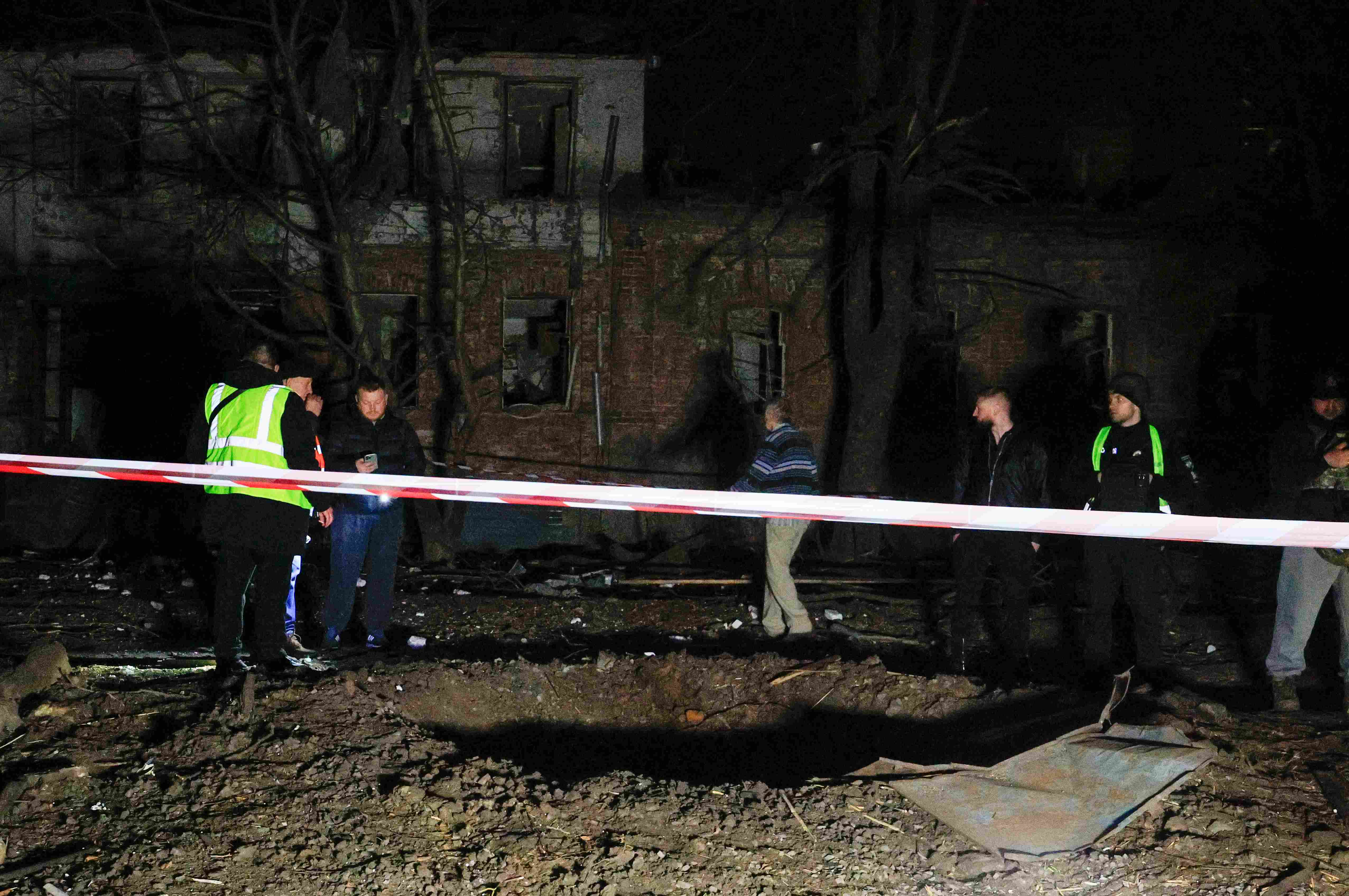 FOTO: Un grupo de personas rodea el cráter donde impactó uno de los drones rusos sobre una zona residencial de Járkov. (EFE/EPA/Sergey Kozlov)