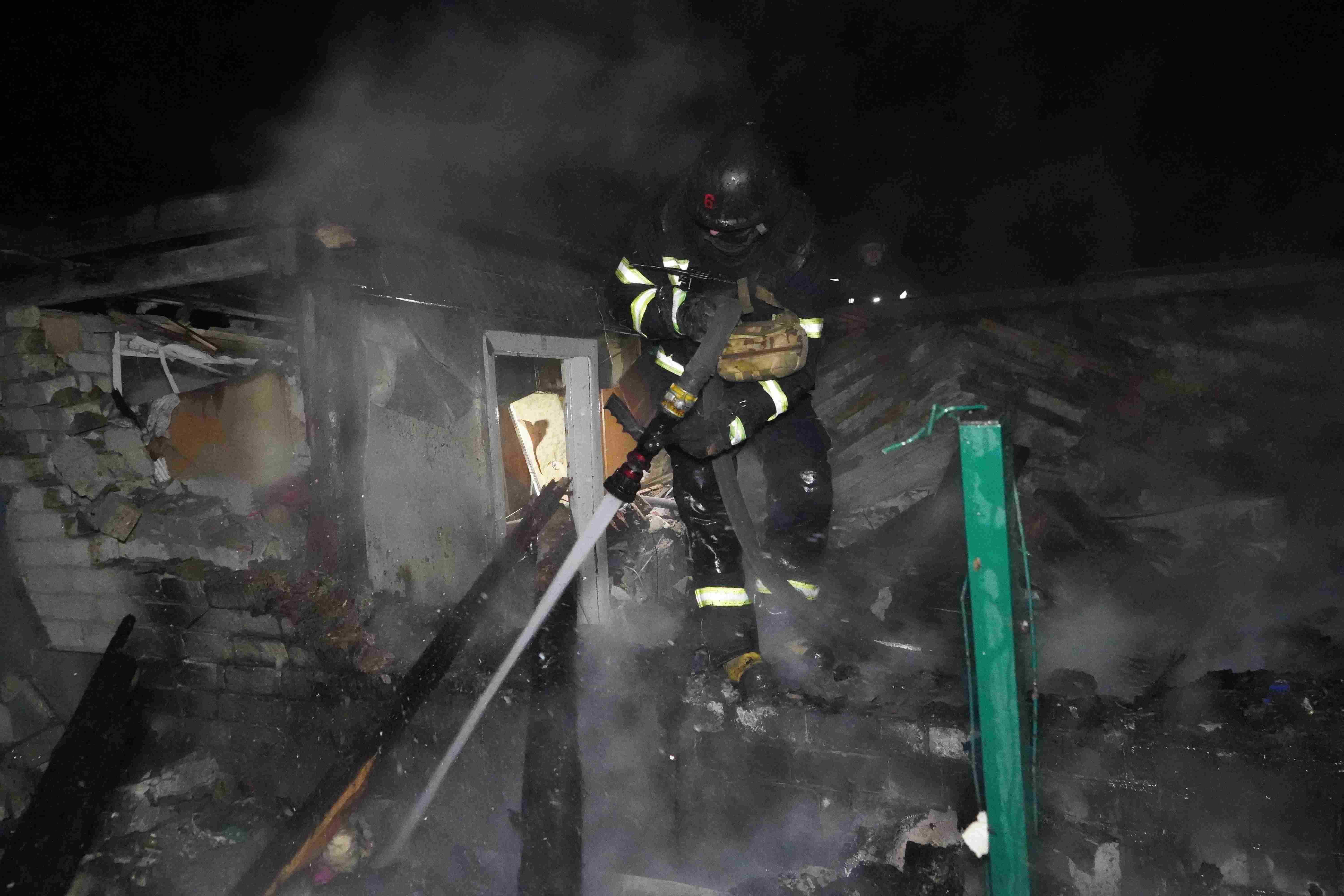 FOTO: Un bombero rocío agua sobre una casa destruida por el bombardeo en Jarkov (AP/Andrii Marienko)