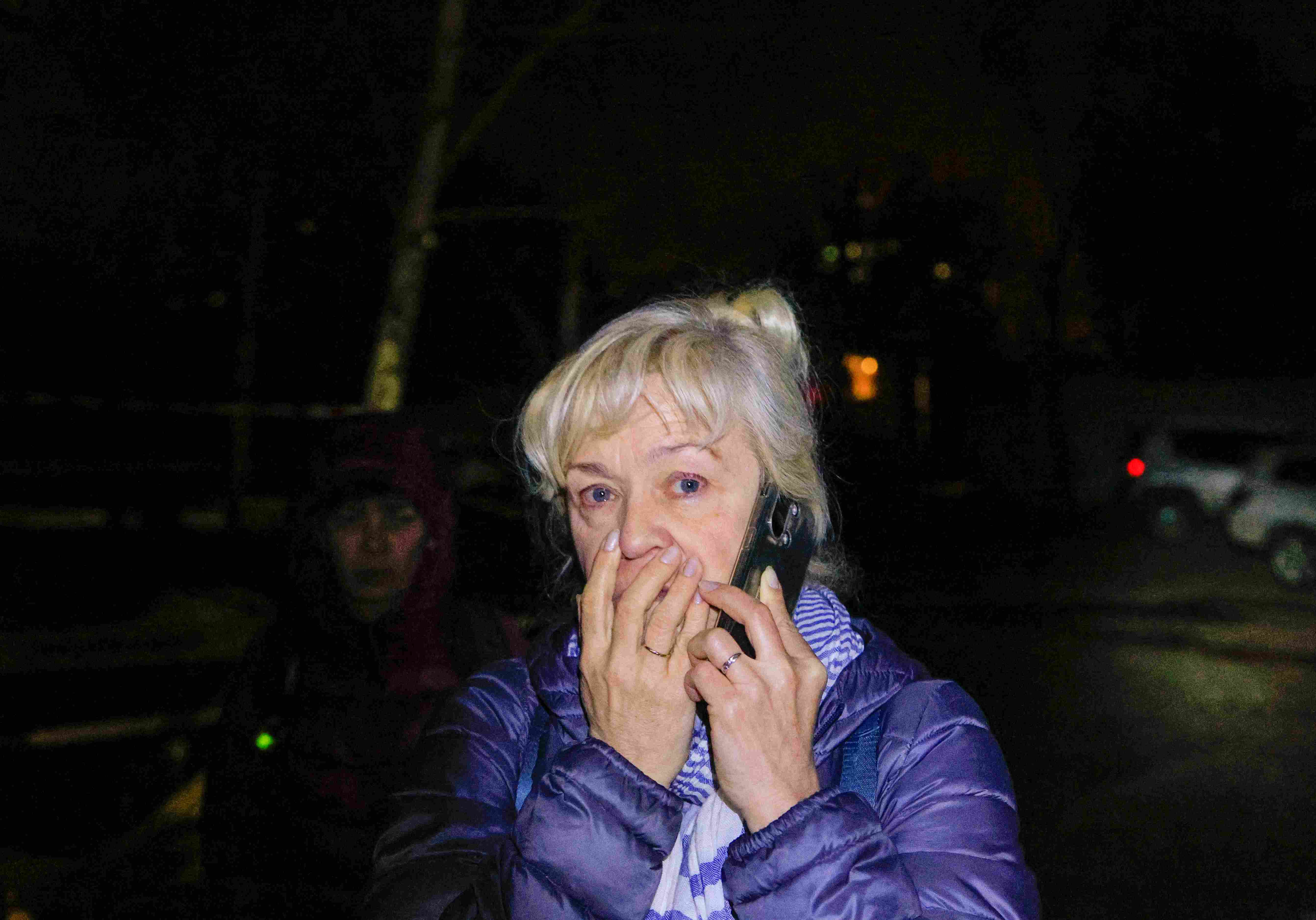 FOTO: Una vecina de la zona residencial de Jarkov atacada por drones rusos habla por teléfono desde la calle en plena noche (EFE/EPA/Sergey Kozlov)