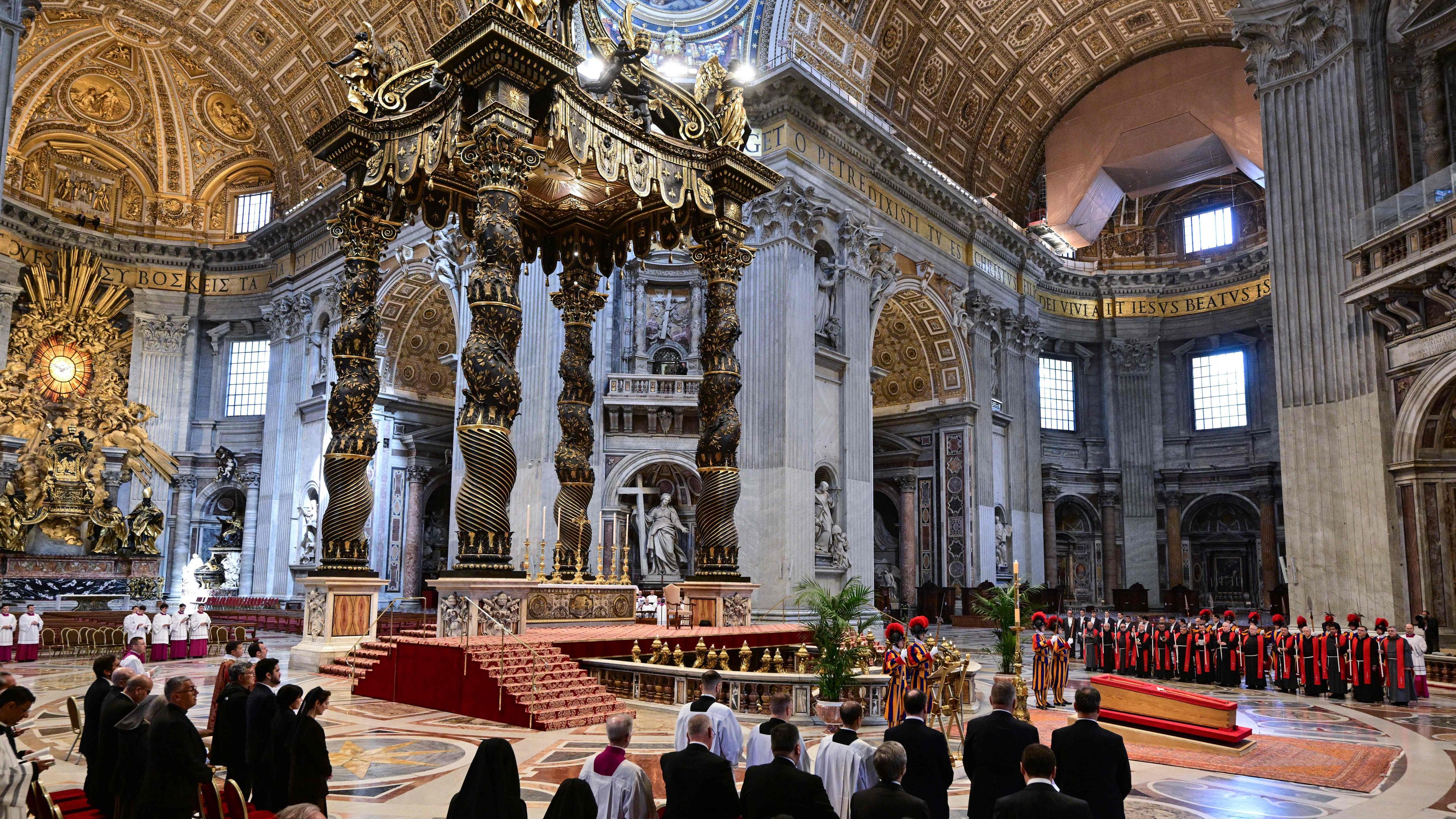 Sobre las 9:30 horas, el féretro ha entrado en la basílica de San Pedro y una vez en el interior, ha sido colocado a nivel casi del suelo, frente a la tumba de San Pedro y enfrente del imponente baldaquino de Bernini, sobre una pequeña plataforma, en el altar de la Confesión.