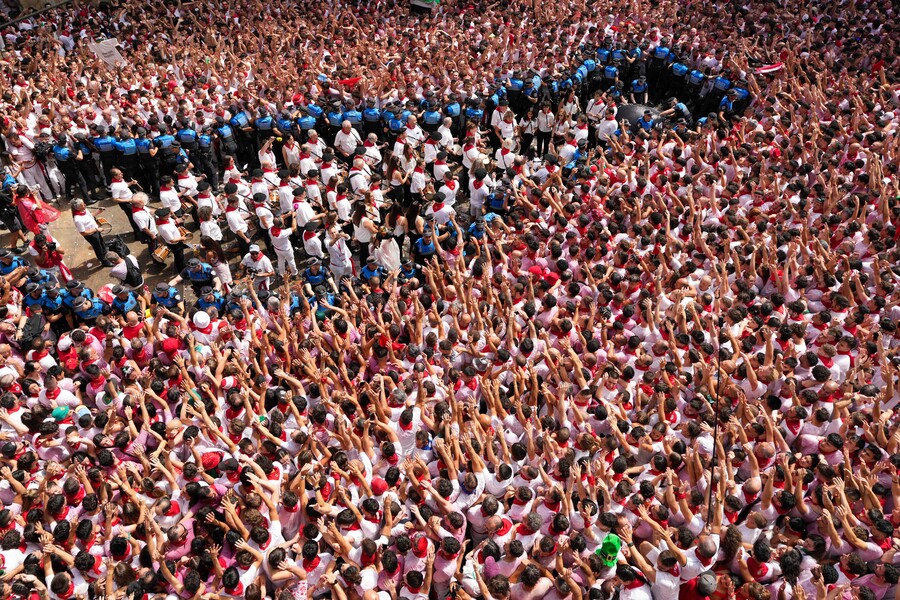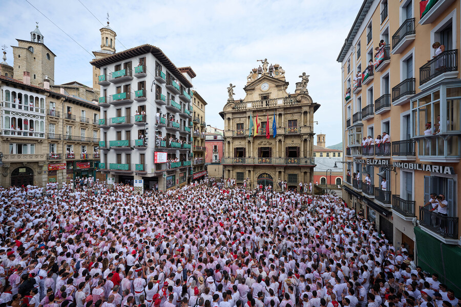 Se calcula que en todo Pamplona hay más de 25.000 personas en las calles esperando a las 12 del mediodía que suene el cohete. De ellas, más de 14.000 están en la plaza aguardando el momento del Chupinazo.