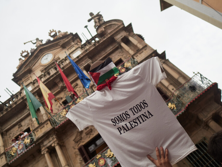 Mientras, tanto en el Ayuntamiento como en los balcones de la plaza, además del tradicional pañuelo rojo, se pueden ver otros pañuelos y banderas en solidaridad con Palestina.
