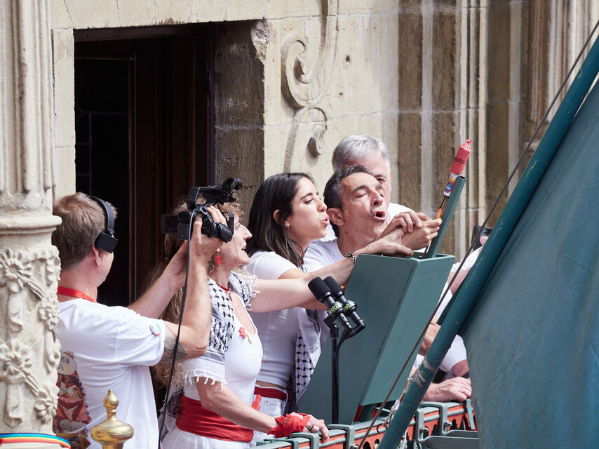 "Pamplonesas, pamploneses, ¡Viva San Fermín!, ¡Gora San Fermín!", han proclamado desde el balcón del Ayuntamiento Lidón Soriano, Dyna Kharrat y Eduardo Ibero, los tres representantes de la plataforma Yala Nafarroa por Palestina, elegida por consulta popular. "Free Palestine, viva Palestina libre", han proclamado, lanzando el cohete, que se ha resistido un poco.