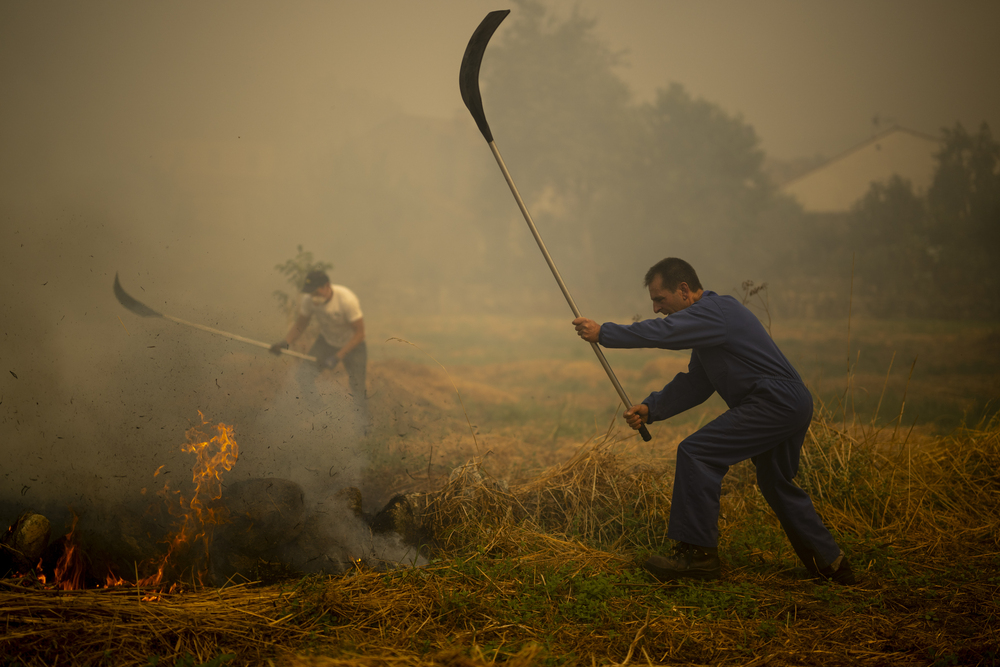 En esta fotografía, varios vecinos de la aldea de Lamas, en Ourense, intentan aplacar el fuego que continúa afectando a la zona. La medida de confinamiento por los incendios se ha levantado para más de 200 personas en distintos puntos de la provincia, aunque se mantiene para otras 120. El 112 Galicia ha informado de que han concluido los de Rebordedondo, en Cualedro, —60 personas—, y los de As Casas dos Montes, en Oímbra, —142 personas—. (EFE / BRAIS LORENZO)