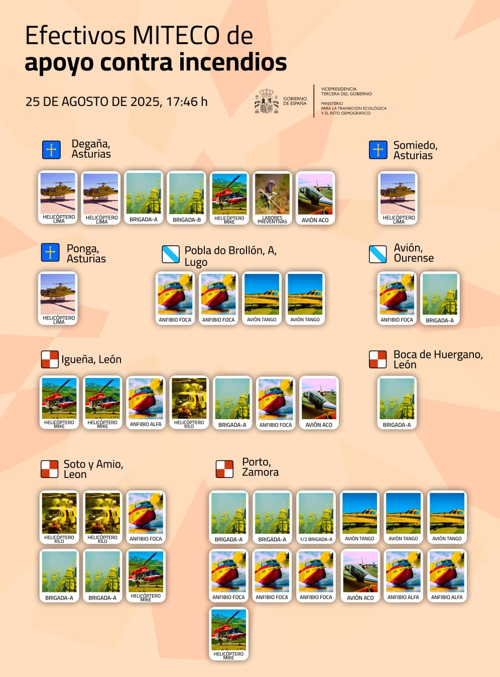Según el último parte, a las 17:46 horas actuaban helicópteros, aviones anfibios y brigadas helitransportadas en fuegos activos en Degaña, Ponga y Somiedo (Asturias), A Pobra do Brollón (Lugo), Avión (Ourense), así como en varios municipios de León —Igueña, Soto y Amío y Boca de Huérgano— y en Porto, en la provincia de Zamora.
