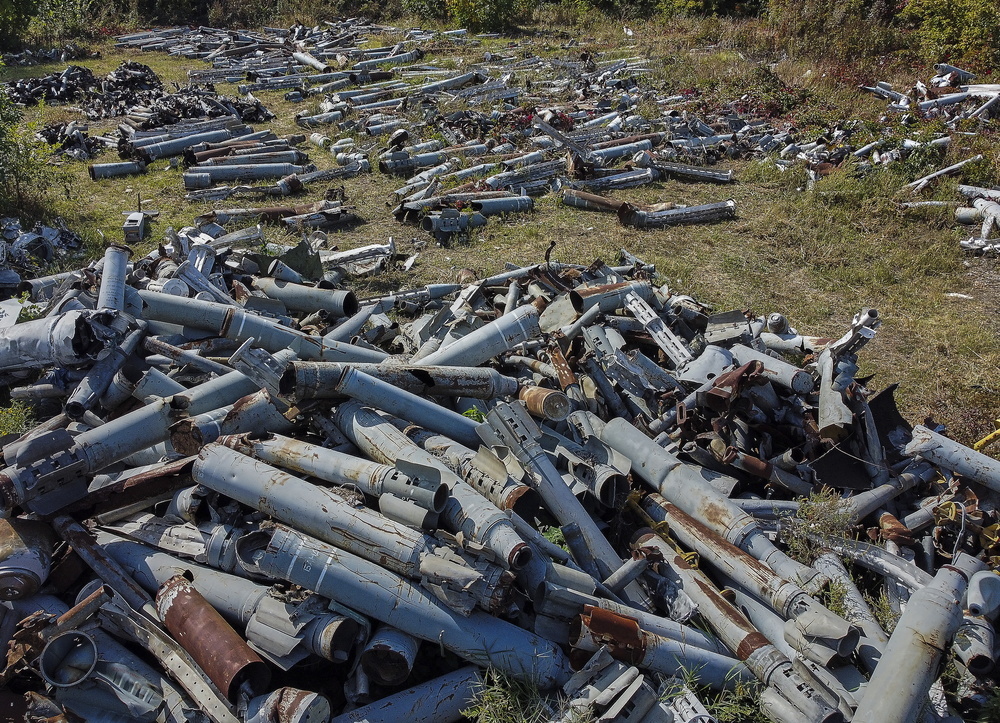 Vista de restos militares, incluidos misiles, drones y municiones, recogidos y almacenados como evidencia de los bombardeos rusos, en Járkov, al noreste de Ucrania. Esta ciudad y sus alrededores han estado bajo intensos bombardeos desde que Rusia lanzó su invasión a gran escala del país en febrero de 2022.