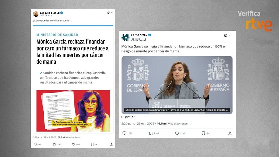 Un mensaje compartido más de 2.000 veces en X difunde una foto de la ministra de Sanidad y afirma: “¿Cómo puedes conciliar el sueño?”. La publicación adjunta la imagen de una noticia de un medio digital con el siguiente titular: “Mónica García rechaza financiar por caro un fármaco que reduce a la mitad las muertes por cáncer de mama”. Otro mensaje compartido más de 1.000 veces en la misma red social dice que “Mónica García se niega a financiar un fármaco que reduce un 50% el riesgo de muerte por cáncer de mama”.
