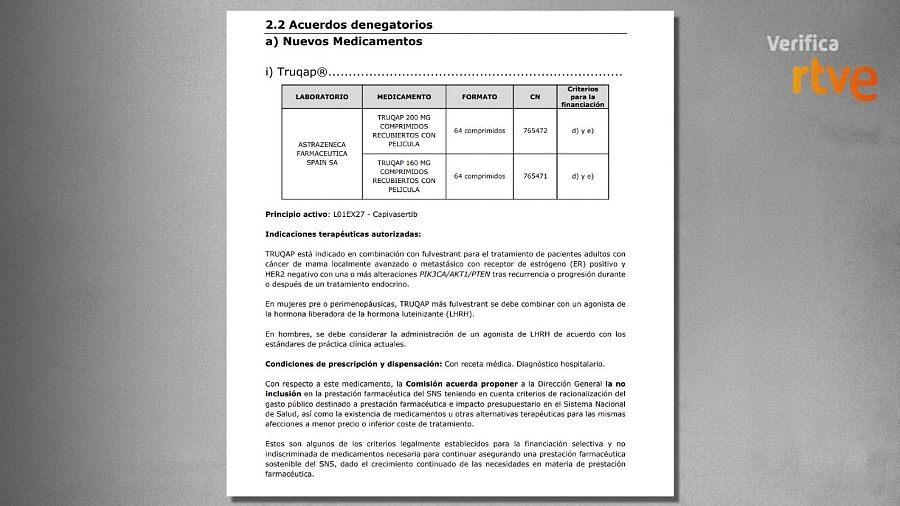 Para tomar una decisión, la Comisión Interministerial cuenta entre otra información con los informes de posicionamiento terapéutico (IPT), que son evaluaciones sobre la eficacia y la seguridad del medicamento. Este es el IPT sobre el Truqap (capivasertib). Tras una consulta por correo electrónico, el Ministerio de Sanidad se remite a este informe y explica que se trata de un medicamento autorizado porque demostró eficacia. Según el Ministerio de Sanidad, el informe revela datos “inmaduros” sobre la supervivencia global que podría obtener este fármaco y que, por tanto, “existe incertidumbre” sobre sus efectos reales en este sentido. “El IPT concluye que dada la falta de evidencia directa e indirecta no es posible posicionar a capivasertib frente a otras opciones de tratamiento de segunda línea”, agrega el Ministerio (página 16 del IPT).