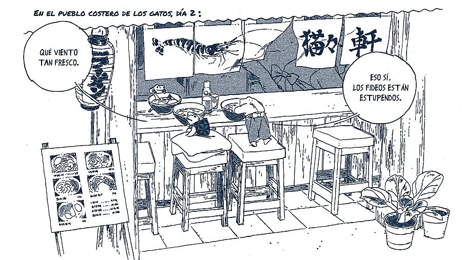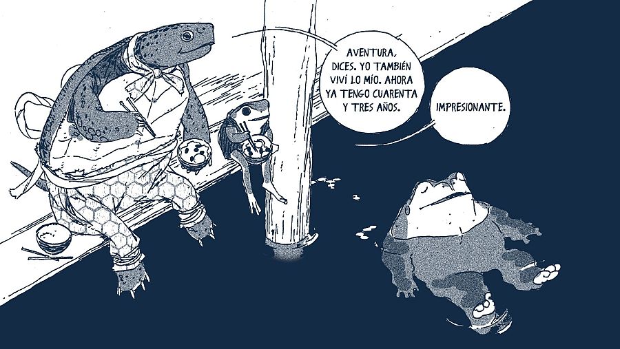 Un cómic que está muy inspirada en la iconografía japonesa y sus leyendas, de ahí que los sapos vistan esos kimonos y disfruten comiendo ramen. Y que está compuesta de pequeñas historias que la ranita irá conociendo en su viaje.