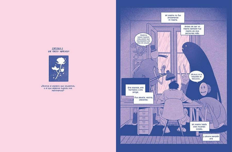 La elección del color rosa es evidente, pero... ¿por qué lo combina con el azul? Siempre intento que el color en mis cómics sea un elemento narrativo más que aporte algo a la historia. En este caso, el rosa de fondo representa a mi madre, que es el lienzo sobre el que yo dibujo (de ahí el azul tinta) esta historia. El otro protagonista de Rosa, el fantasma, es lo único de todo el cómic que es blanco. Porque en este caso el blanco representa la ausencia de Rosa".