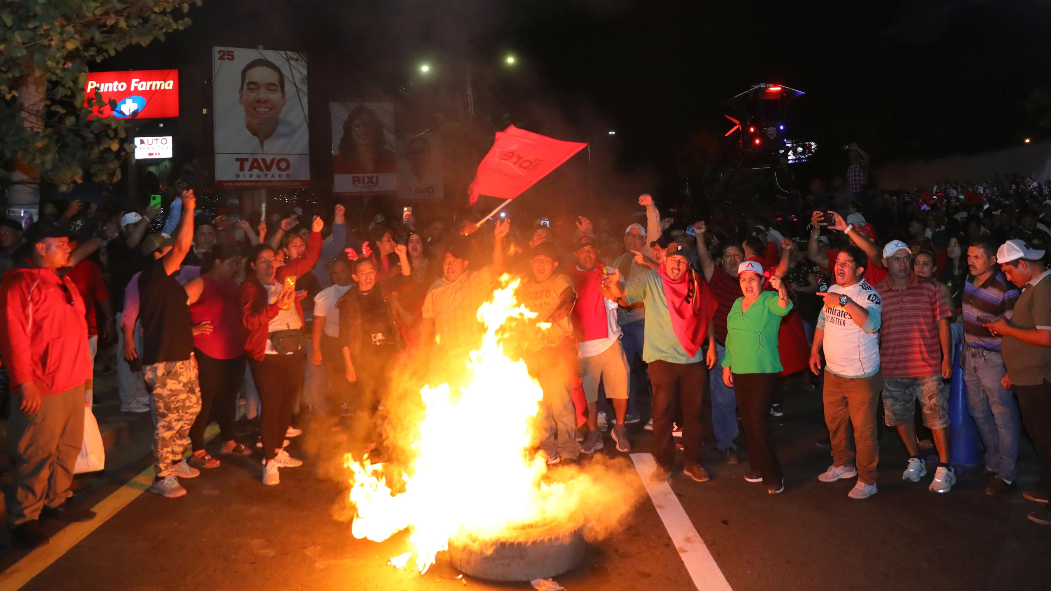 Cayendo la tarde, un grupo de militantes del Partido Libre protestó en Tegucigalpa en rechazo a los resultados de las elecciones, que califican de un golpe electoral en marcha.