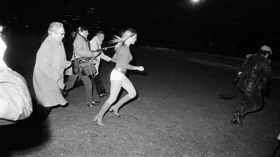En esta foto, Bardot trata de escapar entre risas de los reporteros gráficos durante su visita al Colombes Stadium, cerca de París, donde le tocó dar el puntapié inicial de un partido amistoso en 1971.