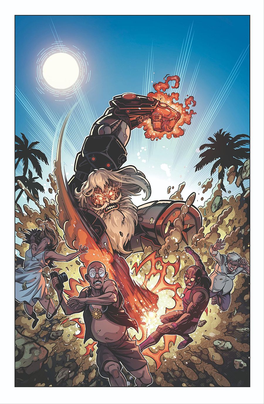 Y por supuesto es un gustazo ver a los Ibéroes librar sus batallas en escenarios de la geografía española en vez de Nueva York. "Con Ibéroes -nos cuenta Iñigo-, hemos podido ver batallas y acontecimientos en Barcelona, Madrid, Huesca, Jerez, Alicante, Lisboa... En el universo donde viven nuestros héroes, España y Portugal forman parte de un mismo país, y algunos hechos históricos son un poco divergentes, ya que la capital está en Lisboa, sin ir más lejos. Mallorca era un enclave muy interesante para esta aventura porque me ha permitido hacer una historia de "peligro playero", aunque reconozco que me he contenido, ya que mi primera idea era llevar la batalla y la destrucción por toda la isla, y al final todo transcurre en enclaves muy concretos: la playa de Es Carbó, al sur, y el Parque Nacional de Cabrera".