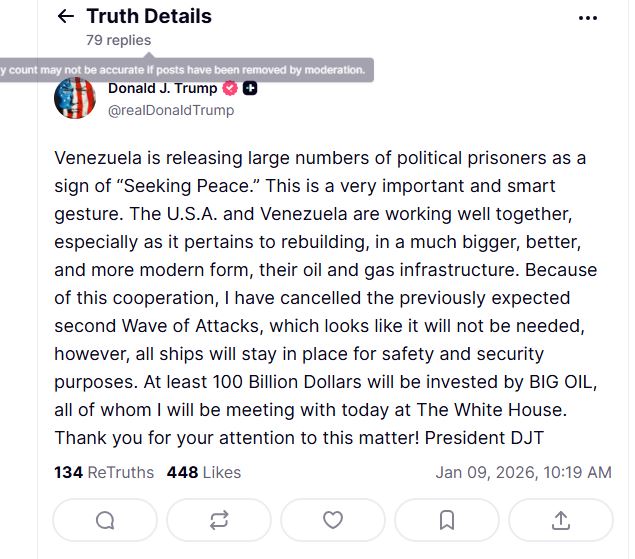 Esta es nuestra traducción: "Venezuela está liberando a un gran número de presos políticos como señal de 'buscar la paz'. Este es un gesto muy importante e inteligente. EE.UU. y Venezuela están trabajando bien juntos, especialmente en lo que respecta a reconstruir, de forma mucho más grande, mejor y moderna, su infraestructura de petróleo y gas. A causa de esta cooperación, he cancelado la segunda oleada de ataques prevista previamente, que parece que no será necesaria, sin embargo, todos los buques permanecerán en su lugar por razones de seguridad. Las grandes compañías petroleras invertirán al menos 100.000 millones de dólares, me encontraré con todas ellas hoy en la Casa Blanca. ¡Gracias por su atención en este asunto!".