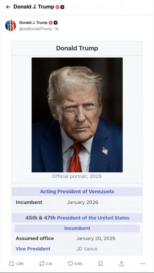 El presidente estadounidense, Donald Trump, ha publicado este domingo en Truth Social una imagen manipulada de su perfil en Wikipedia, en la que se atribuye el cargo de "presidente interino de Venezuela" a fecha de enero de 2026.