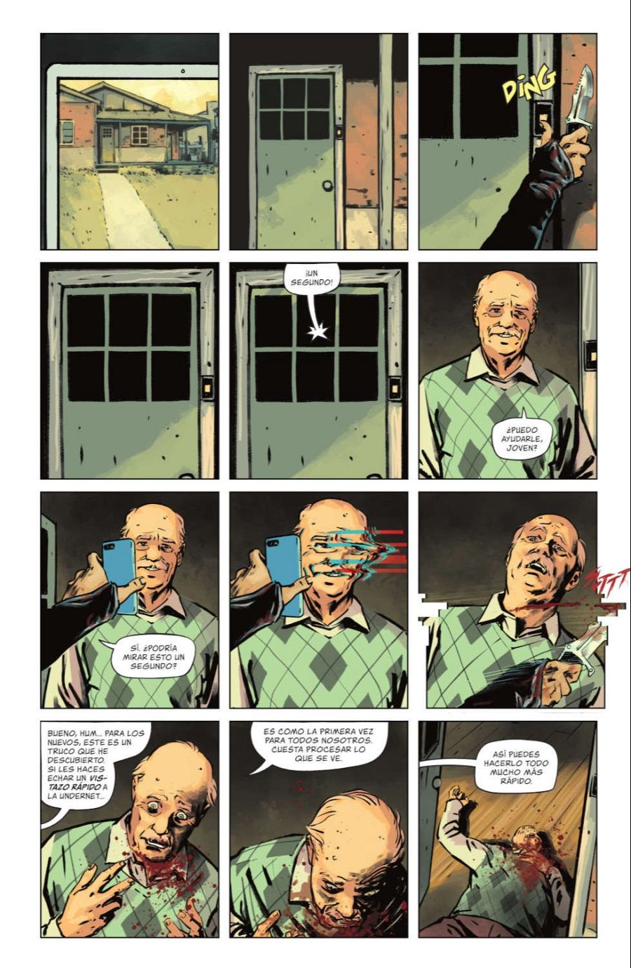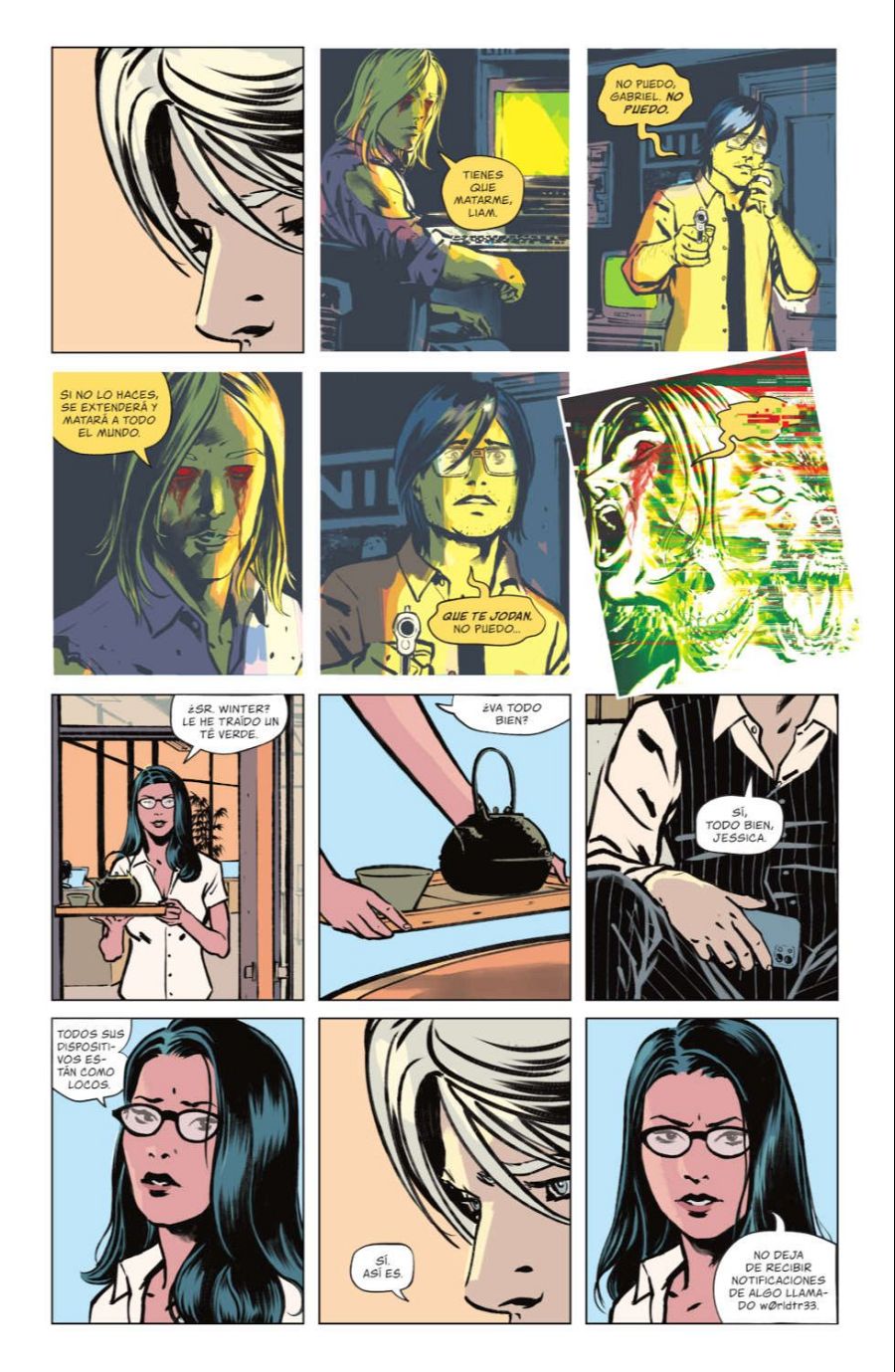“También es fundamental el color de Jordi, de gran importancia a la hora de crear esas atmósferas -continúa el dibujante-. O las onomatopeyas que diseña Aditya Bidikar, esos ruidos extraños de que no se pueden leer pero que transmiten una sensación muy inquietante. Muchas veces las letras están dibujadas buscando ese tipo de sonidos que hacía un antiguo módem de internet, esos sonidos chirriantes que son muy difíciles de imitar con la voz. Todos esos elementos forman parte de la búsqueda de esa atmósfera inquietante”.