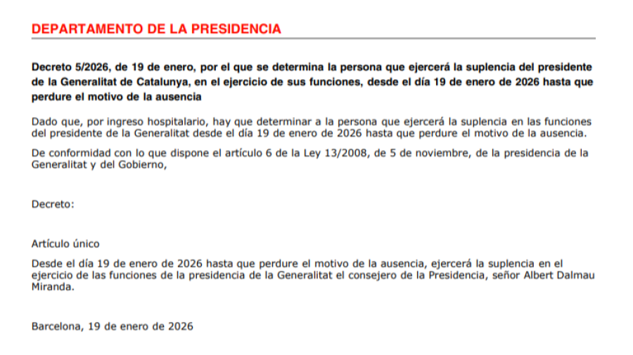 Durante su recuperación, será el consejero de presidencia, Albert Dalmau, quien ejercerá la suplencia de las funciones del presidente de la Generalitat, según el decreto publicado este lunes en el Diario Oficial de la Generalitat de Cataluña.