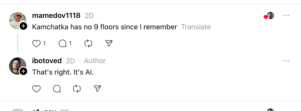 No es una grabación real, son imágenes creadas con inteligencia artificial. Dos herramientas de detección de contenidos creados con IA determinan que se ha generado con esta tecnología. Así lo concluye Hive Moderation con un 99,6% de fiabilidad en su predicción. Además, el perfil de Hive en X advierte a un usuario de la red social de que este vídeo ha sido creado con IA. El análisis realizado por Eurovision News Spotlight con Google SynthID determina que este vídeo está generado con la IA de Google, tal y como puedes comprobar en la siguiente imagen. Además, el verificador turco Teyit señala que este contenido lo compartió por primera vez por un usuario de la red social Threads que reconoció a otro que se trataba de IA cuando este le dijo que no "recordaba que Kamchatka tuviera edificios de nueve pisos".