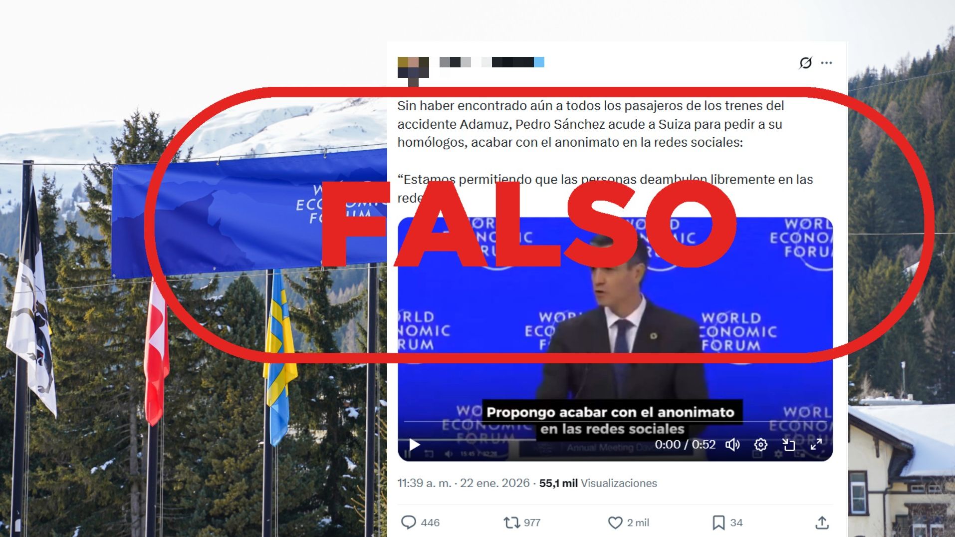 "Sin haber encontrado aún a todos los pasajeros de los trenes del accidente Adamuz, Pedro Sánchez acude a Suiza para pedir a sus homólogos, acabar con el anonimato en la redes sociales", leemos en un mensaje de X difundido el 22 de enero de 2026. La publicación adjunta un vídeo en el que aparece el presidente del Gobierno pronunciando un discurso en inglés sobre el anonimato en las redes sociales.