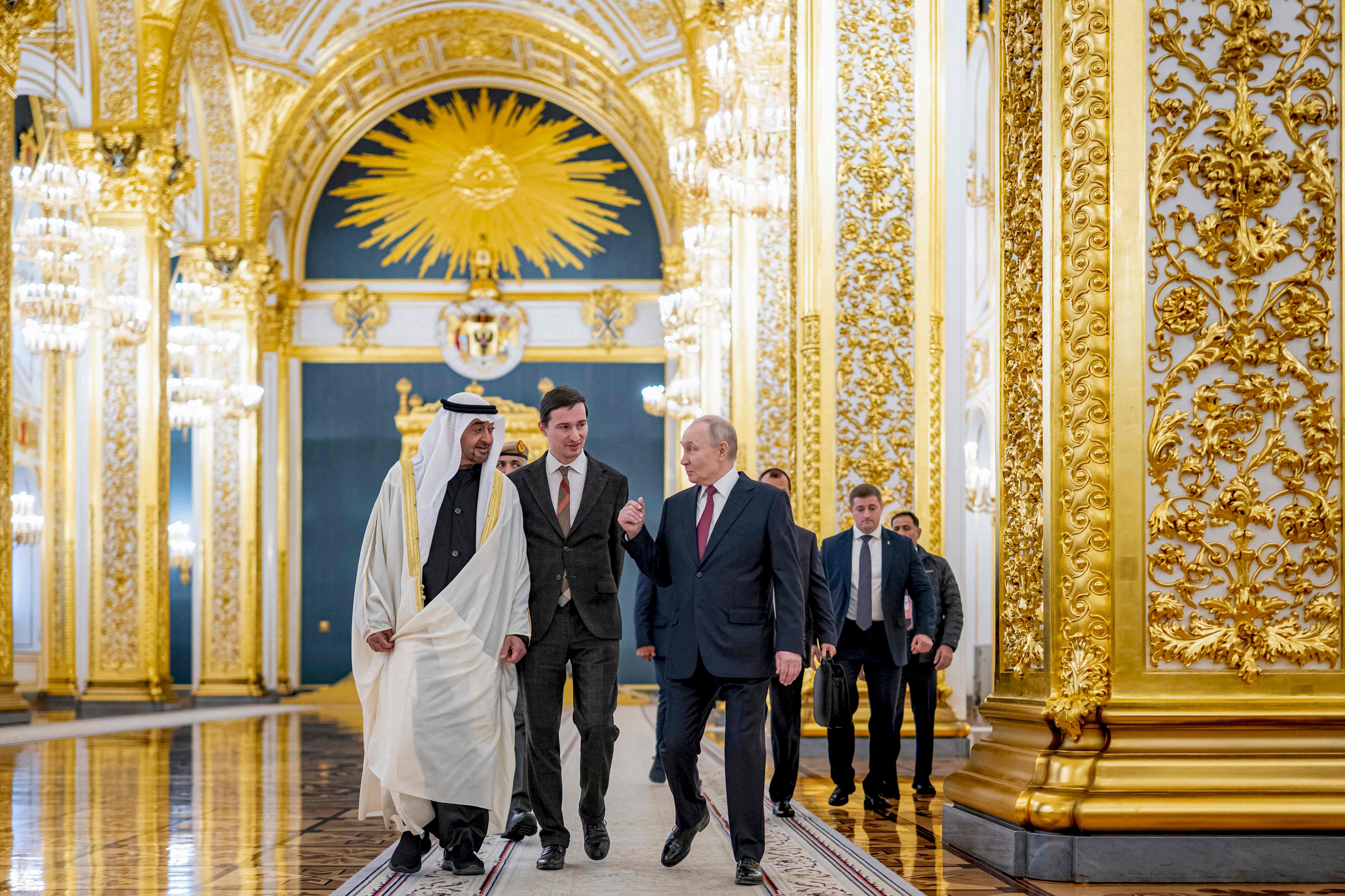 "Por supuesto, seguimos atentamente lo que ocurre en torno a Irán", ha dicho Putin a Bin Zayed tras la ceremonia de bienvenida en la suntuosa Sala de San Jorge.