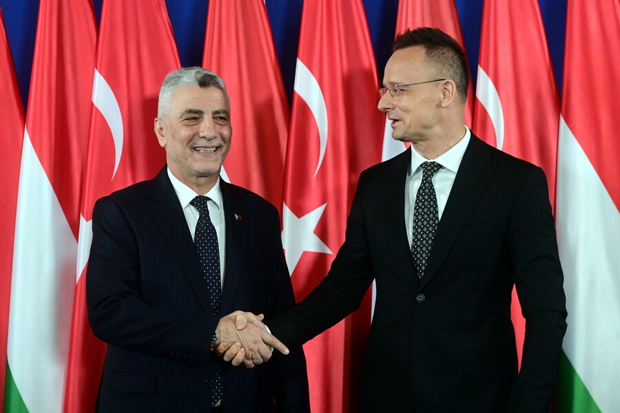 El ministro húngaro de Asuntos Exteriores y Comercio, Peter Szijjarto (derecha), este miércoles al recibir al ministro turco de Comercio, Omer Bolat, antes de la segunda reunión intergubernamental del Comité Conjunto Económico y Comercial de Hungría y Turquía en el Groupama Arena de Budapest.