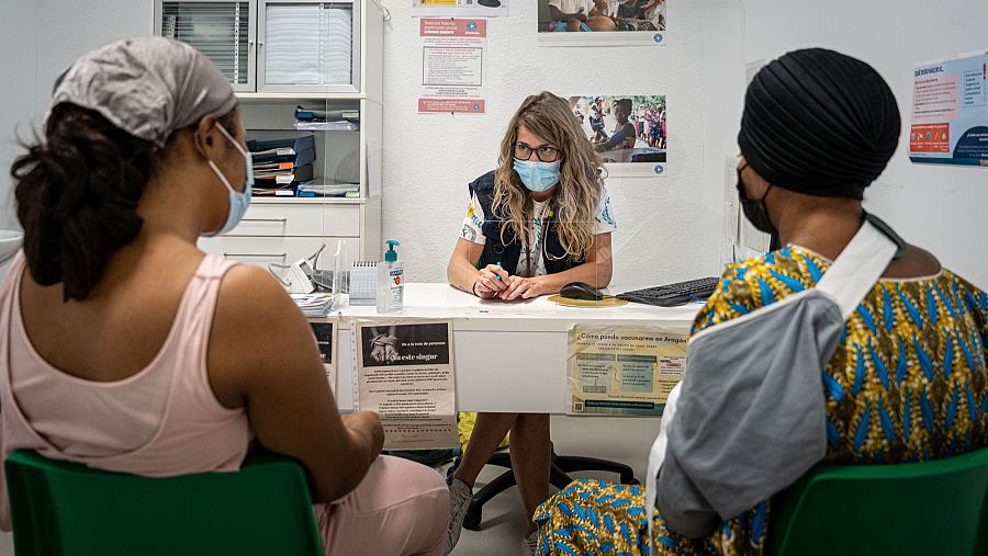 Trabajadora de Médicos del Mundo Aragón atiende a dos inmigrantes Médicos del Mundo Aragón