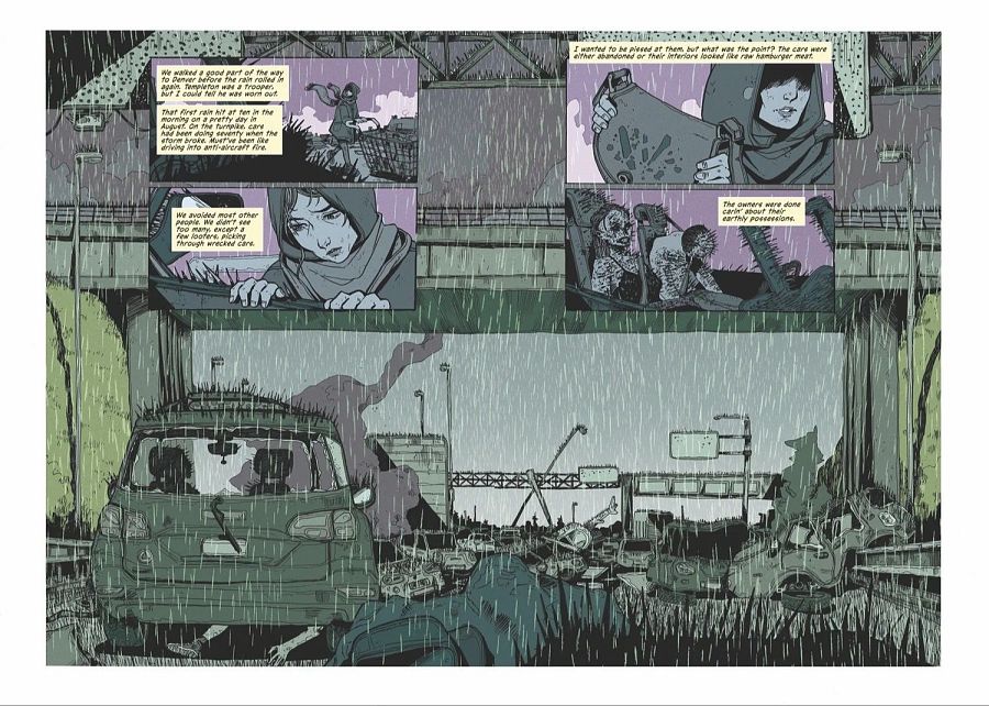 Destacar el dibujo de la británica Zoe Thorogood, sin duda una de las artistas del momento, que, como comenta Joe Hill: "encuentra lo humano en cada imagen de película de terror, los últimos vestigios de calidez en un mundo asombrado por tormentas frías y letales". Gracias a los dibujos de Zoe (nominada a los Eisner a Mejor Artista Multimedia y Mejor Portadista), nos enamoramos de la calidez del personaje protagonista enfrentada a ese mundo apocalíptico. Un mundo que se dirige al caos y que solo es soportable gracias a ella. Me atrevería a decir que ahora mismo, tal y como está el mundo, nos harían falta muchas personas buenas y valientes como ella.