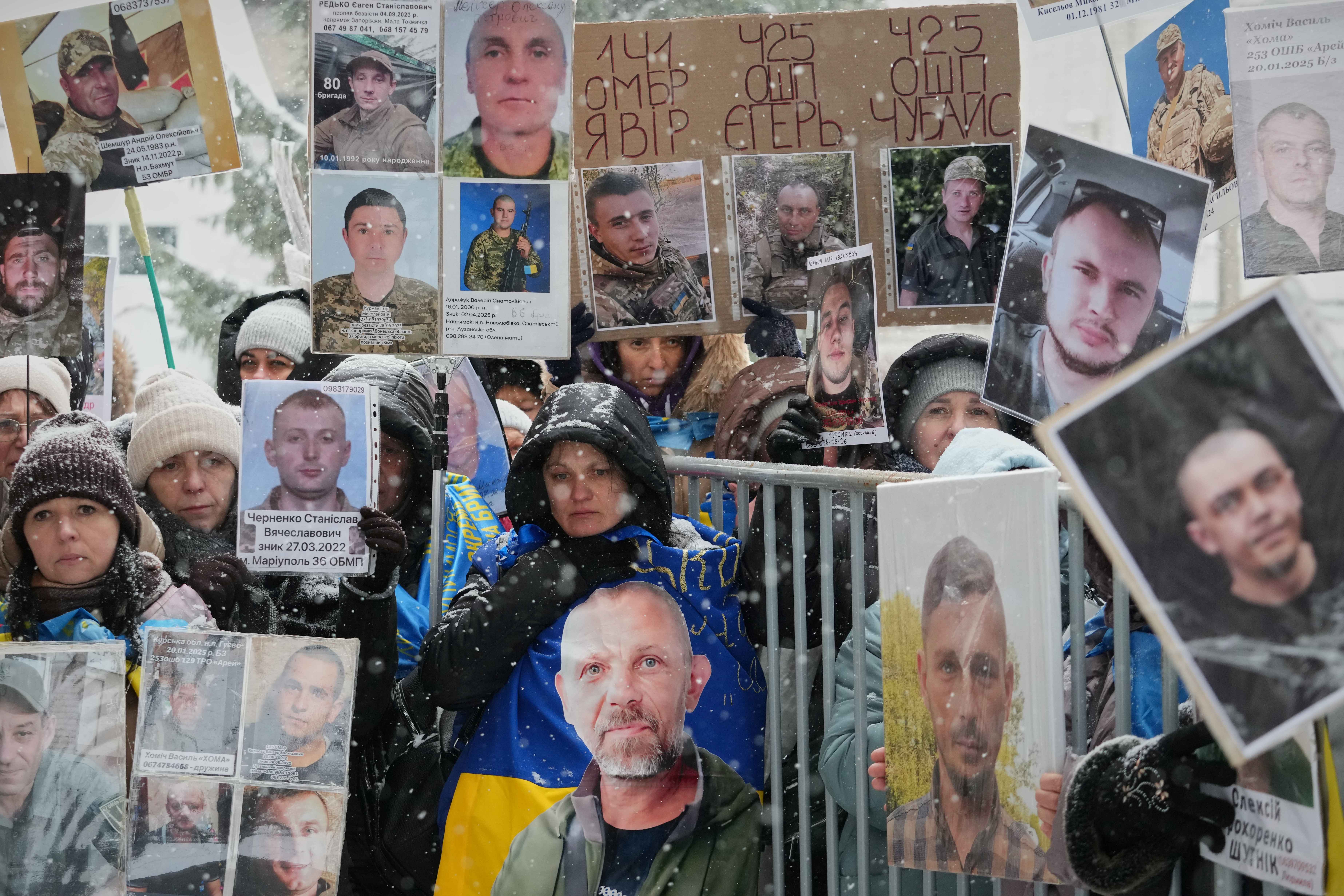 Personas sostienen fotos de sus familiares desaparecidos mientras soldados ucranianos regresan del cautiverio durante un intercambio de prisioneros entre Rusia y Ucrania en la región de Cherníhiv, Ucrania, el jueves 5 de febrero de 2026. (Foto AP/Sergei Grits)