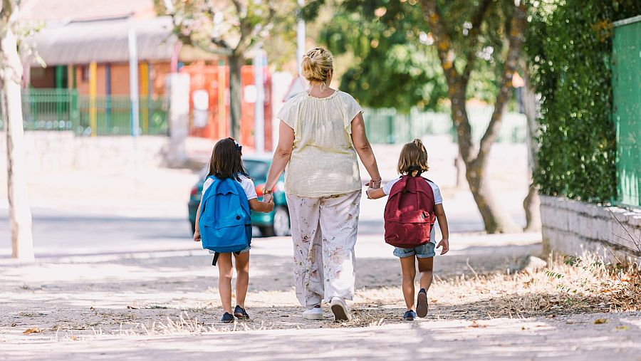 Una madre coge de la mano a sus dos hijos. GETTY