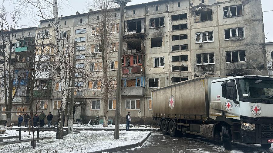 Un camión de la Cruz Roja llega a Krasnogórivka, una pequeña ciudad al oeste de Donetsk totalmente arrasada por los combates. Cuando se detiene ya lo esperan en silencio algunos de los 80 vecinos que siguen viviendo allí. Antes de la guerra tenía más de 15.000 habitantes.