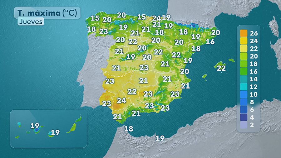 En cuanto a los termómetros, gran parte del interior peninsular registrará temperaturas máximas con valores altos para la época del año. Estas máximas ascenderán en el tercio oeste, mientras que iniciarán un descenso en el resto del territorio y de forma más notable en Canarias y el litoral Cantábrico oriental.