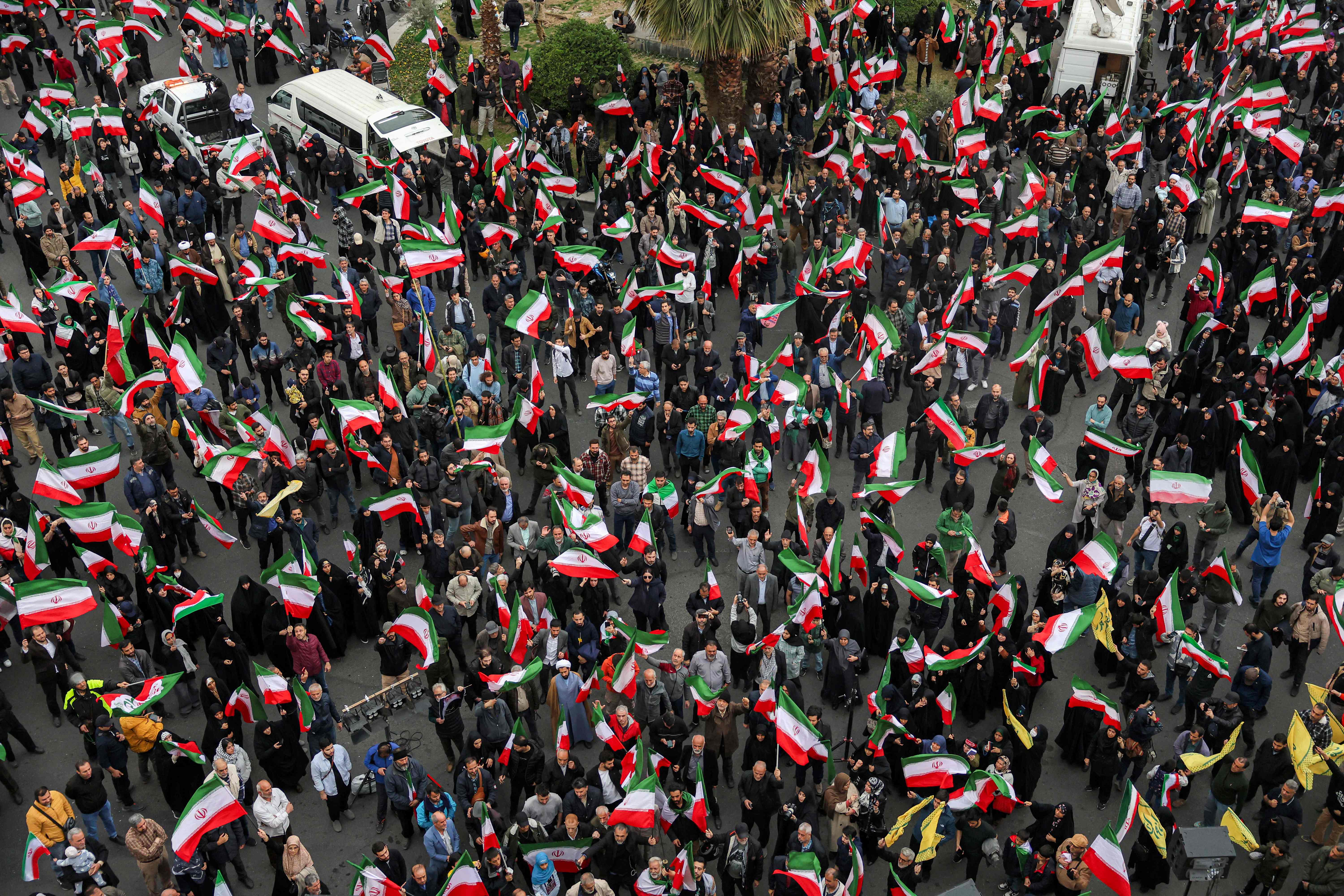 Manifestantes se reúnen con banderas nacionales iraníes durante una manifestación en apoyo al Gobierno y en contra de los ataques estadounidenses e israelíes frente a una mezquita en Teherán