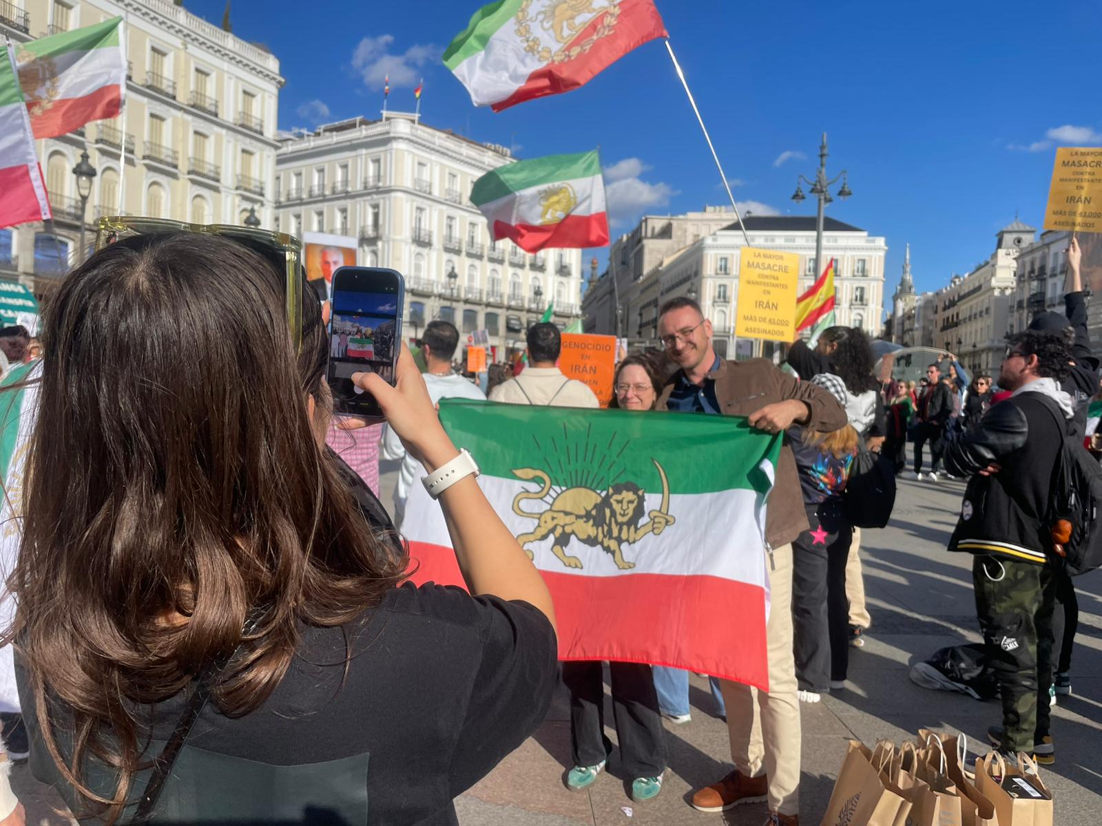 En torno a 100 personas han acudido a la plaza de la Puerta del Sol de Madrid, con banderas de la dinastía del sah persa, para celebrar los ataques de Estados Unidos e Israel contra el régimen de los ayatolás.