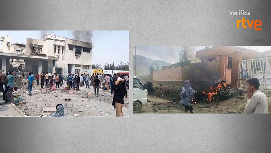 A la izquierda, escuela "bombardeada" en Minab (Irán) el 28 de febrero; a la derecha, coche bomba en Kabul (Afganistán) en mayo de 2021. VerificaRTVE