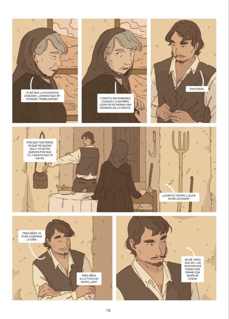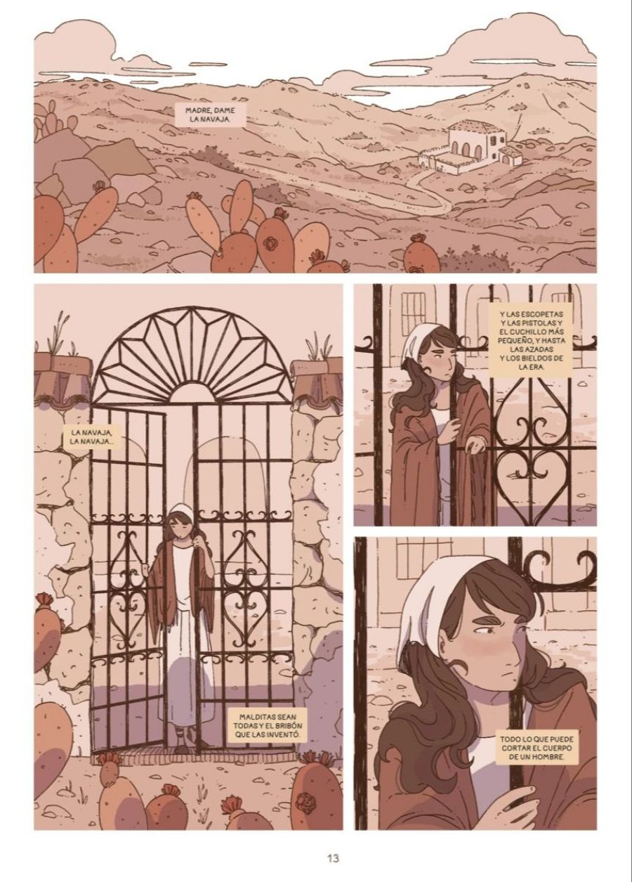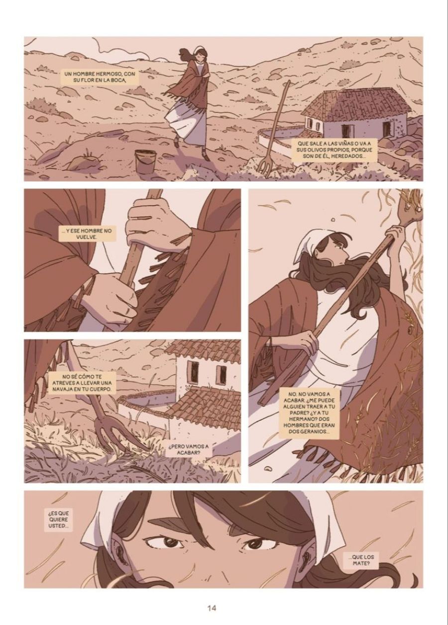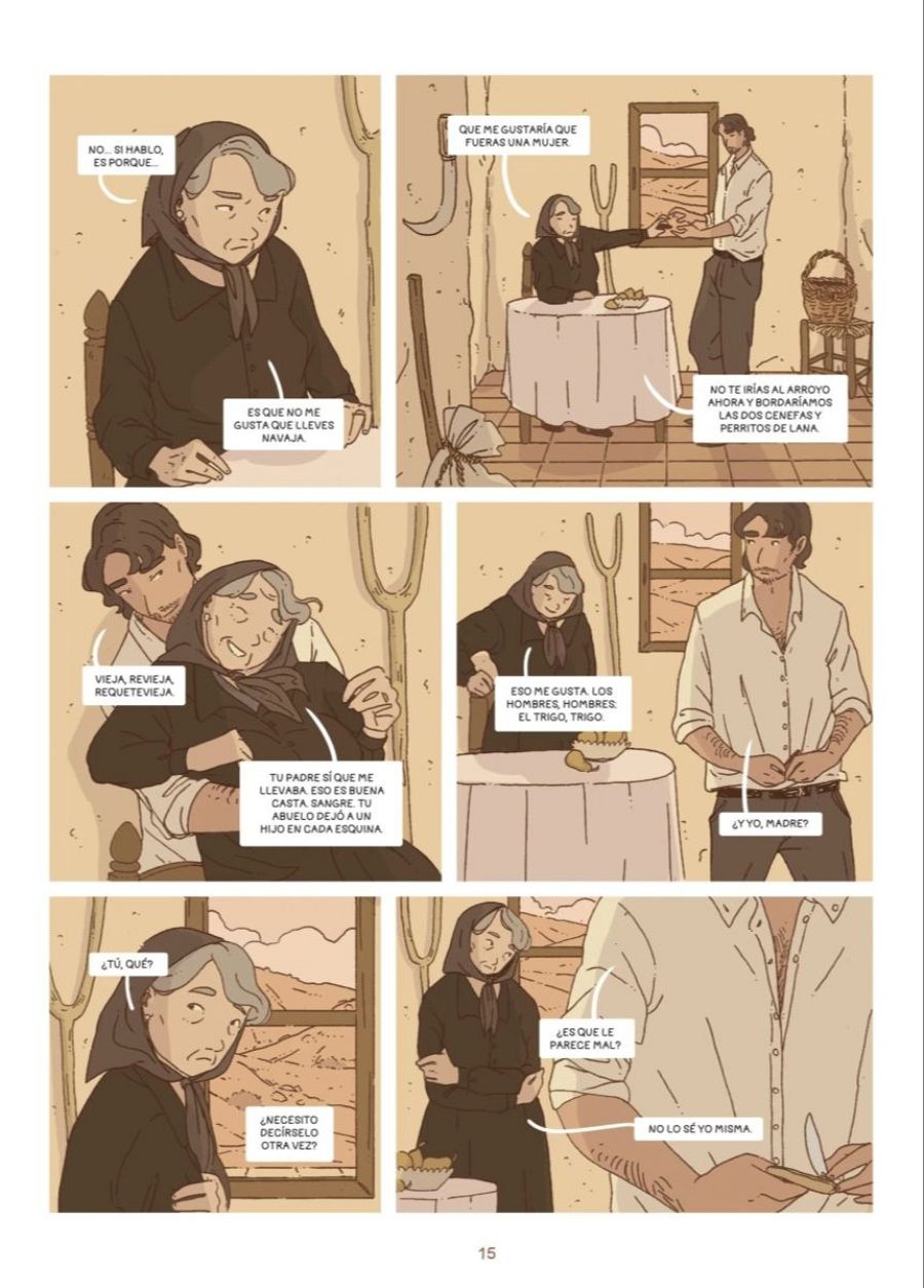 "Pero, por otra parte, me ayudó mucho conectar con las raíces de mi familia, el folclore de mi tierra, porque yo soy de Andalucía, así que fue muy enriquecedor en muchos aspectos. Aunque lo curioso es que para el cómic no he tomado como ejemplo a las mujeres de mi familia sino más bien a los hombres. Yo vengo de una familia de campesinos, mi abuelo fue campesino, mi padre es campesino y yo voy de camino a convertirme en campesina, porque me encanta el campo y la naturaleza y hago senderismo muy a menudo. Mi primer contacto con el cómic fue precisamente dibujando la naturaleza y creo que eso es lo que les llamo la atención a Salva y a Planeta para encargarme este trabajo".