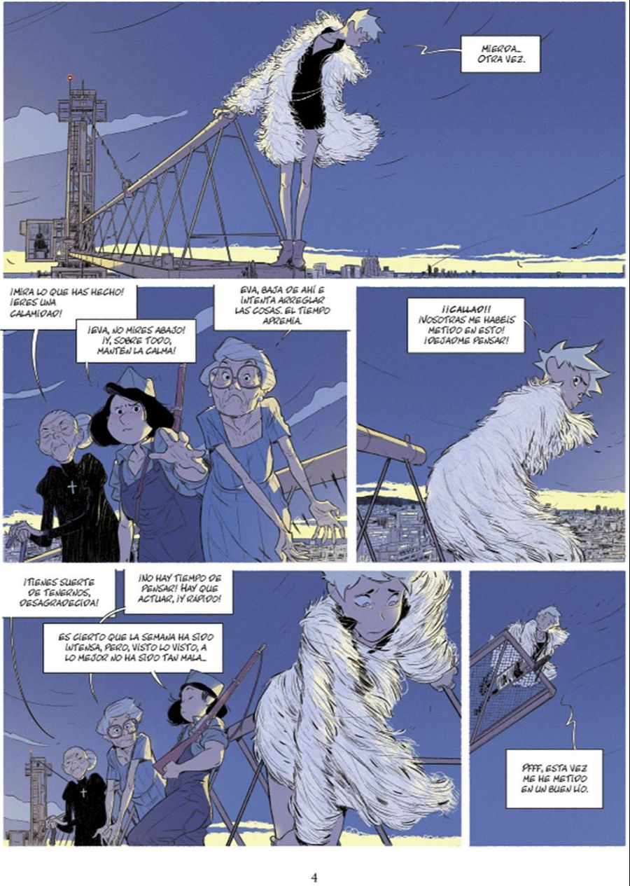 "Además -añade-, esa imagen de Eva paseando por la grúa nos muestra a un personaje un poco vaporoso, un poco con la cabeza en las nubes. No lo vemos como un personaje arrogante que esté por encima de las cosas, sino como a alguien un poco más ligero que nosotros, que está como a medio camino entre el cielo y la tierra. También juego con la idea del ángel, alguien que a veces cae en el infierno, pero cuyo carácter lo puede elevar muy arriba".