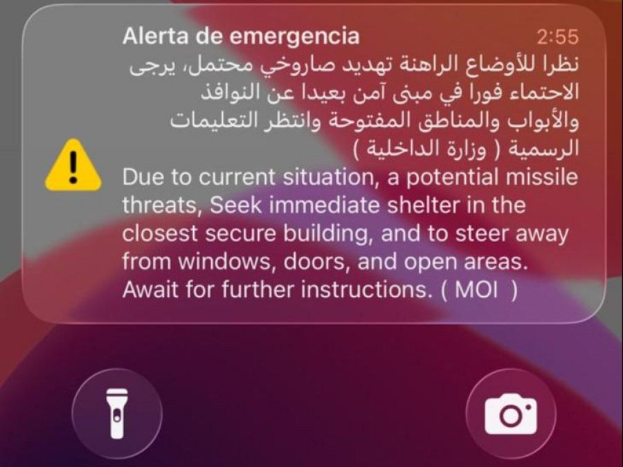 Una de las alertas recibidas en Abu Dabi durante una de las explosiones y facilitada por Ana Cabarcos A.Cabarcos