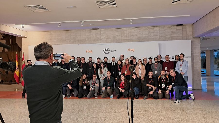 Fidel Parrondo fotografía a algunos compañeros de RTVE que trabajan en el debate