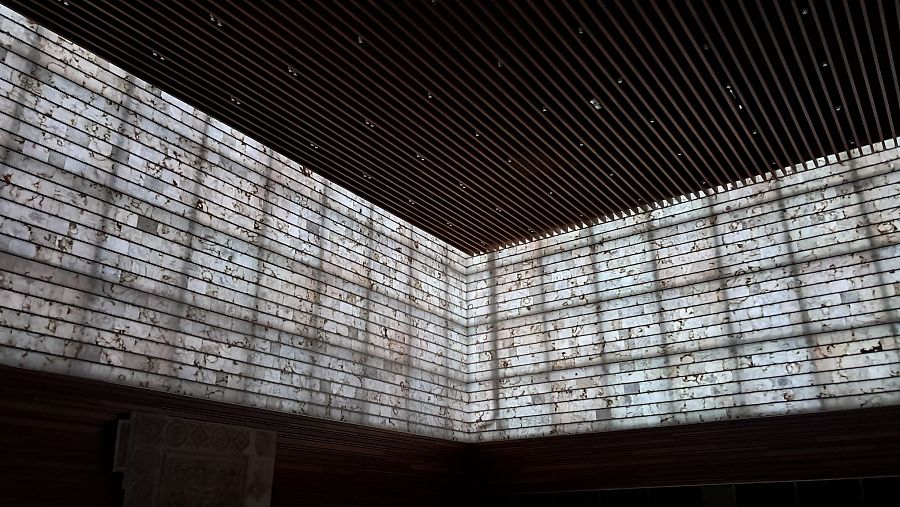 Cubo de alabastro desde el interior del hemiciclo al anochecer
