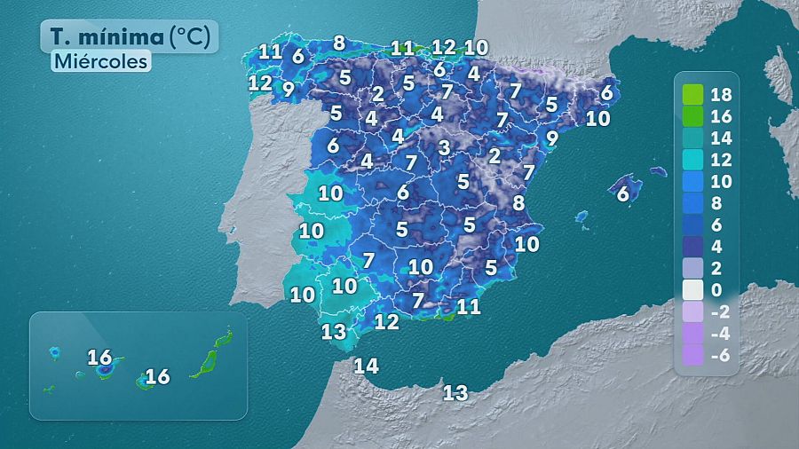 Por su parte, las temperaturas mínimas experimentarán un ascenso de ligero a moderado en territorio peninsular, llegando a ser notable en el Cantábrico oriental, mientras que en el Estrecho y las Canarias occidentales se prevén descensos.